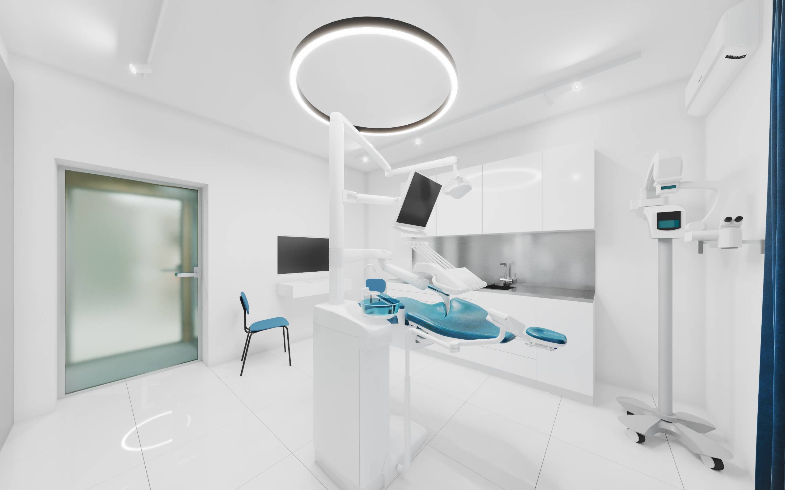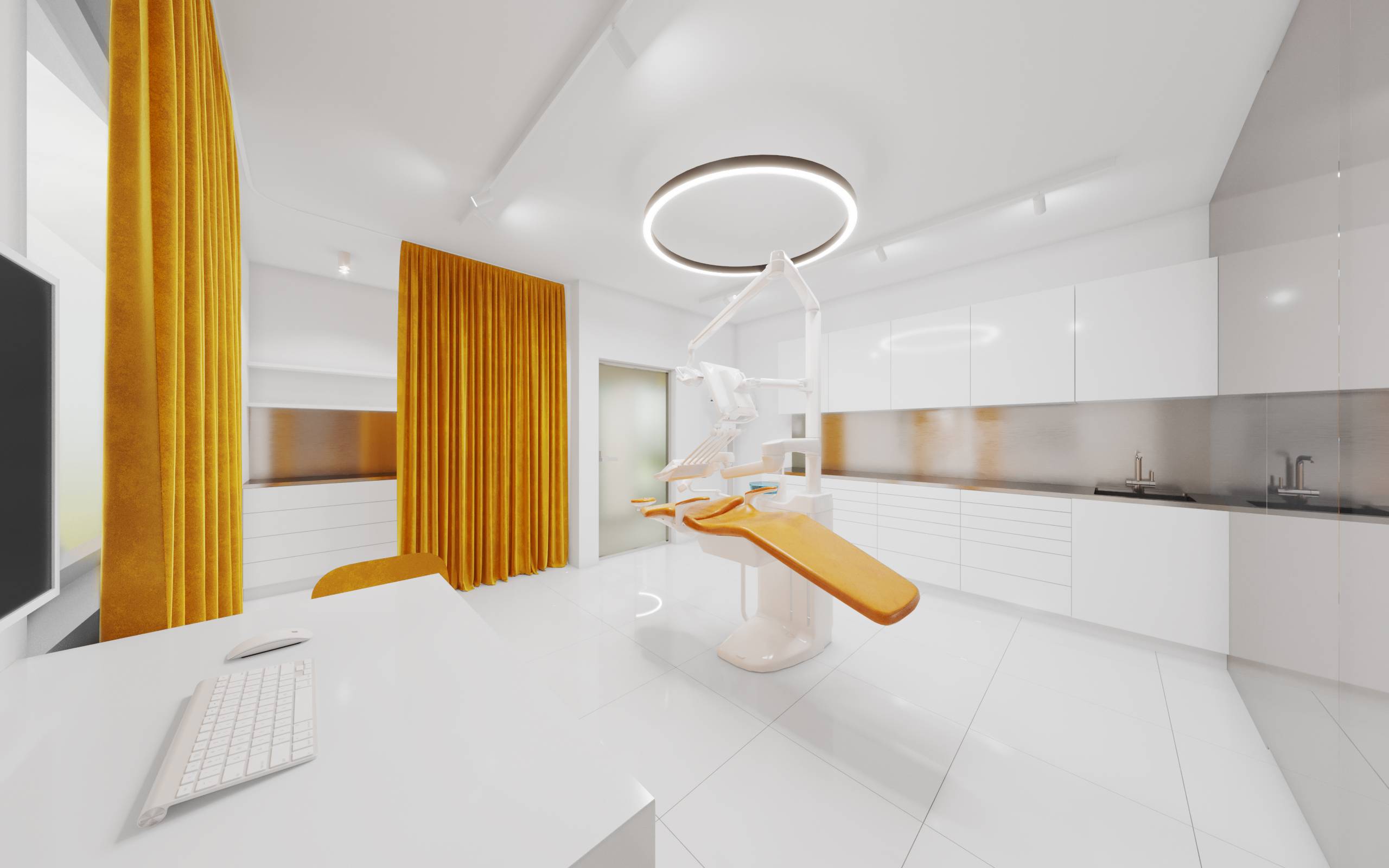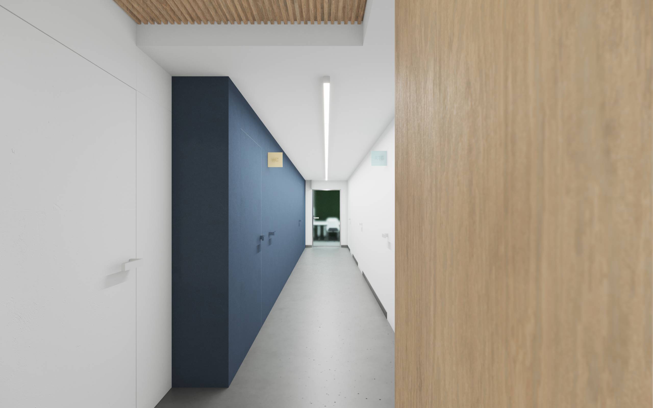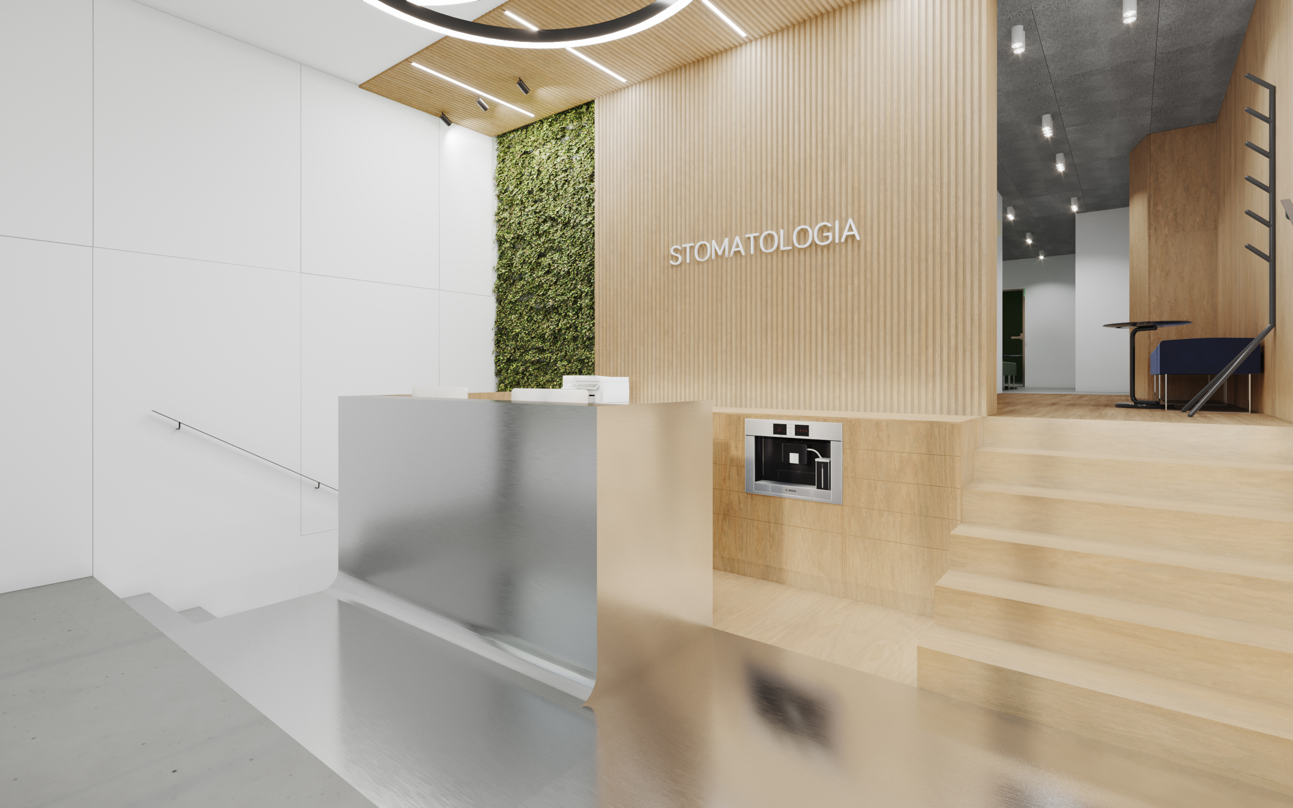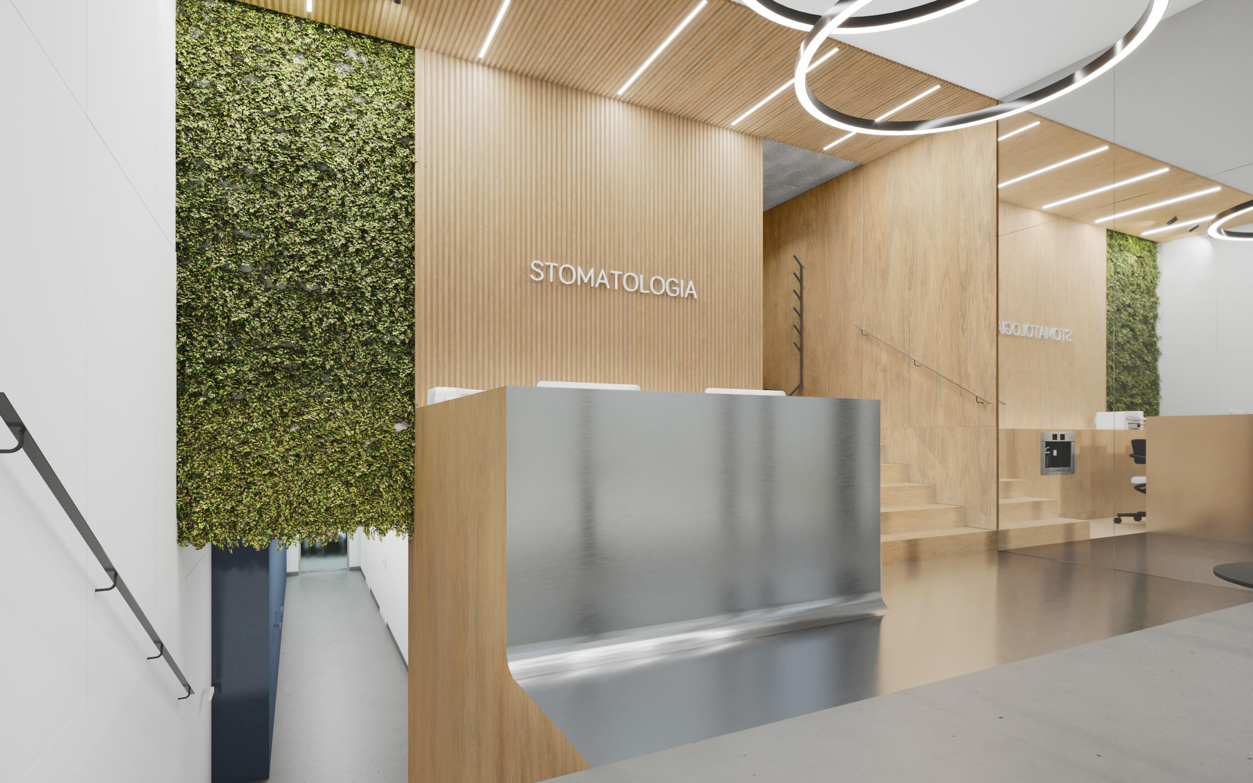 W strefach ogólnodostępnych nadrzędnym celem projektu było stworzenie jasnych, przestronnych i przytulnych wnętrz - interesujących i budzących pozytywne emocje przed stresującym zabiegiem. Wnętrza gabinetów natomiast, zaprojektowane zostały tak, aby podkreślać ich sterylność oraz panującą w klinice czystość i profesjonalizm. Cechy szczególnie ważne dla klientów w dobie panującej na świecie pandemii. Przyciągające wzrok pomieszczenie recepcji widoczne jest już z ulicy poprzez przestronną witrynę. Stanowi swoistą wizytówkę kliniki. Użyte materiały grają ze sobą różnymi fakturami i kolorami. Wnętrze budowane jest przez ich nieoczywiste zestawienia. Ciepłe, iglaste drewno sąsiaduje z surową blachą; lustra i gładkie okładziny zwieńczone są chropowatym sufitem z wełny drzewnej.