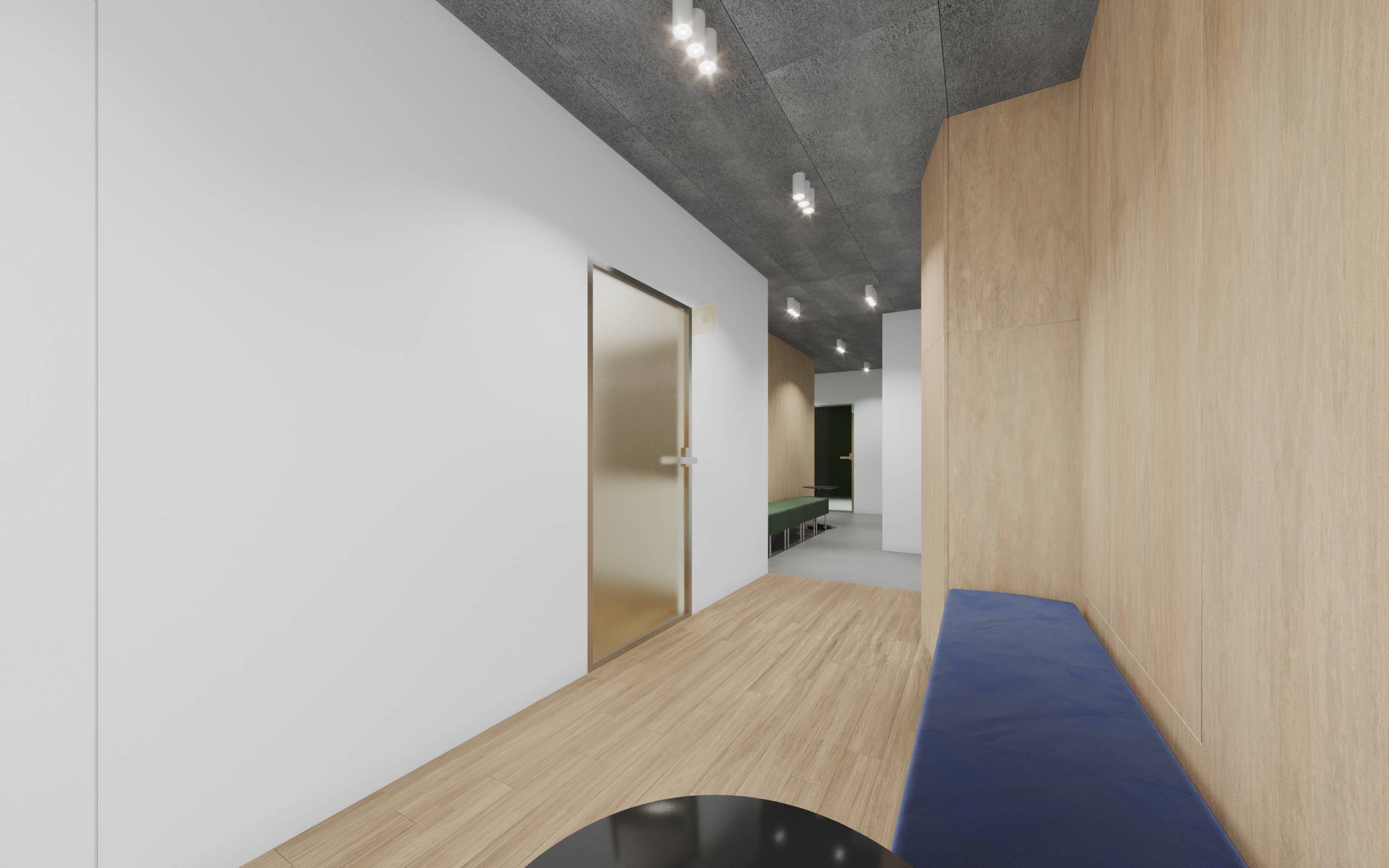 Jasne i białe gabinety rozróżnione są natomiast poprzez użycie kolorów przewodnich, dopełniających detale. Szklane drzwi do gabinetów, pokryte mleczną, kolorową folią, pozwalają na penetrację wnętrz przez światło dzienne, przy jednoczesnym pozostawieniu gabinetów niewidocznymi z zewnątrz. Światło przepuszczane przez barwne szkło sprawia, że wnętrza pokrywane są zmieniającą się, delikatną poświatą kolorów.